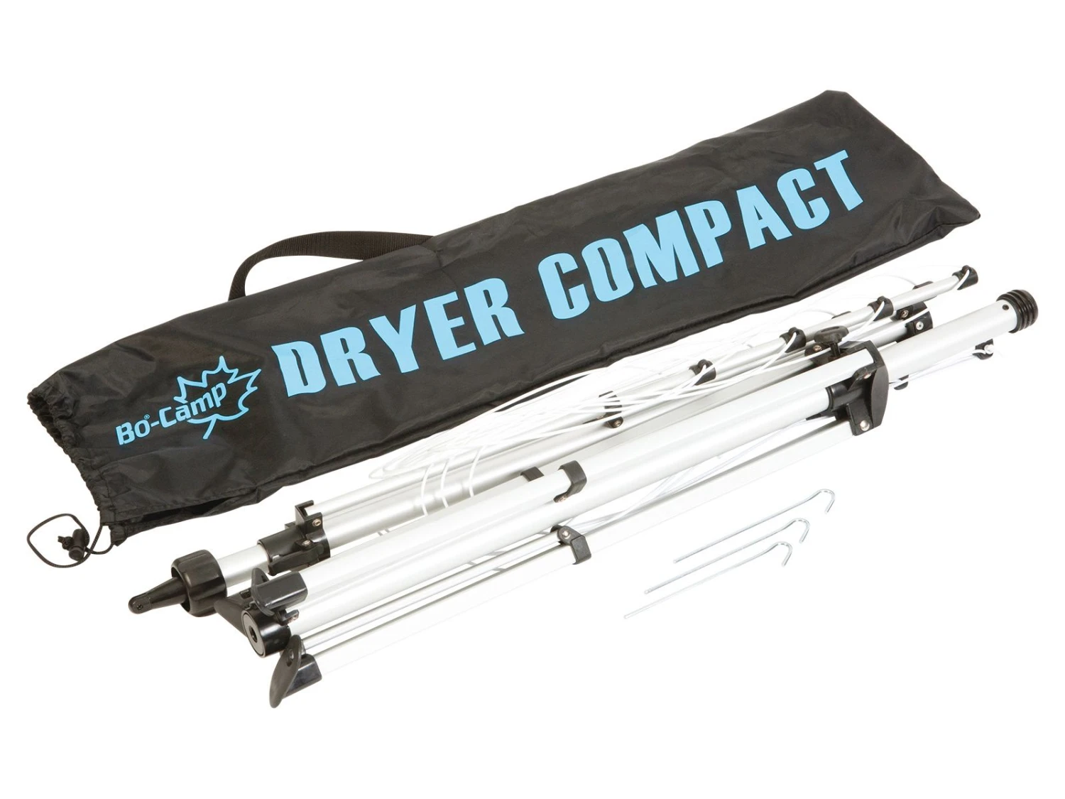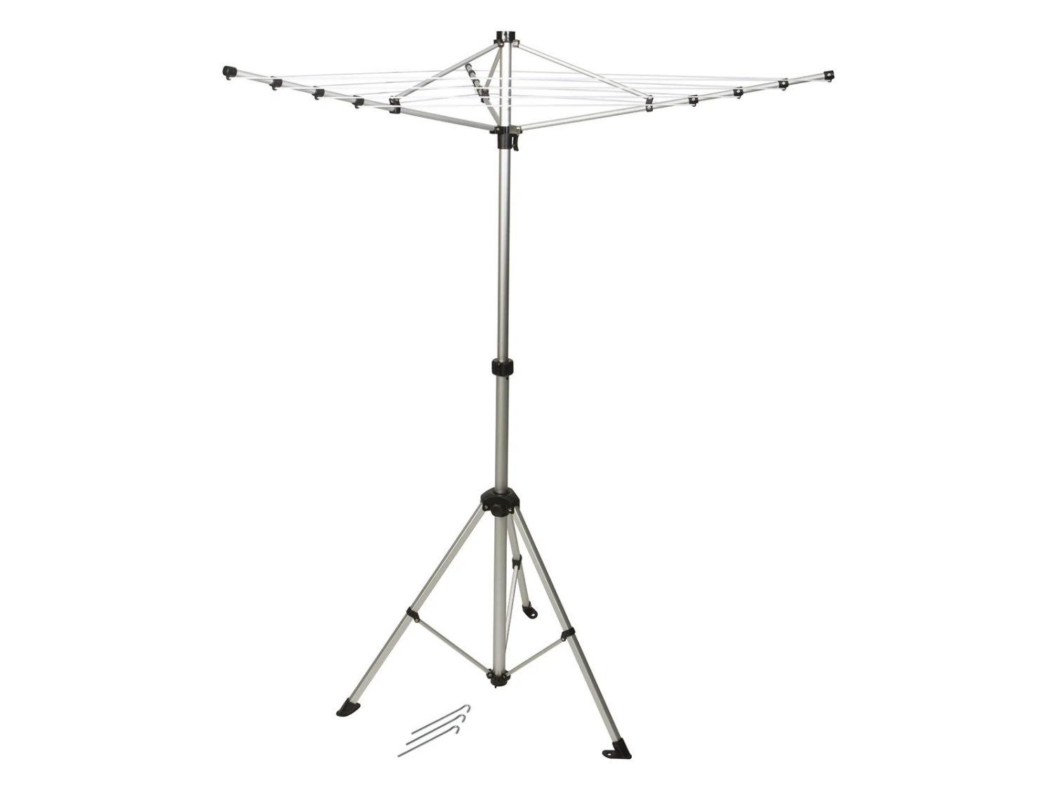 Diese Wäschespinne eignet sich optimal für den Campingplatz und für unterwegs, da diese sehr kompakt zusammengeklappt werden kann. Die Wäschespinne ist von 136 cm bis 185 cm höhenverstellbar und wird mit 3 Heringen geliefert, um den Wäscheständer fest im Boden zu verankern.