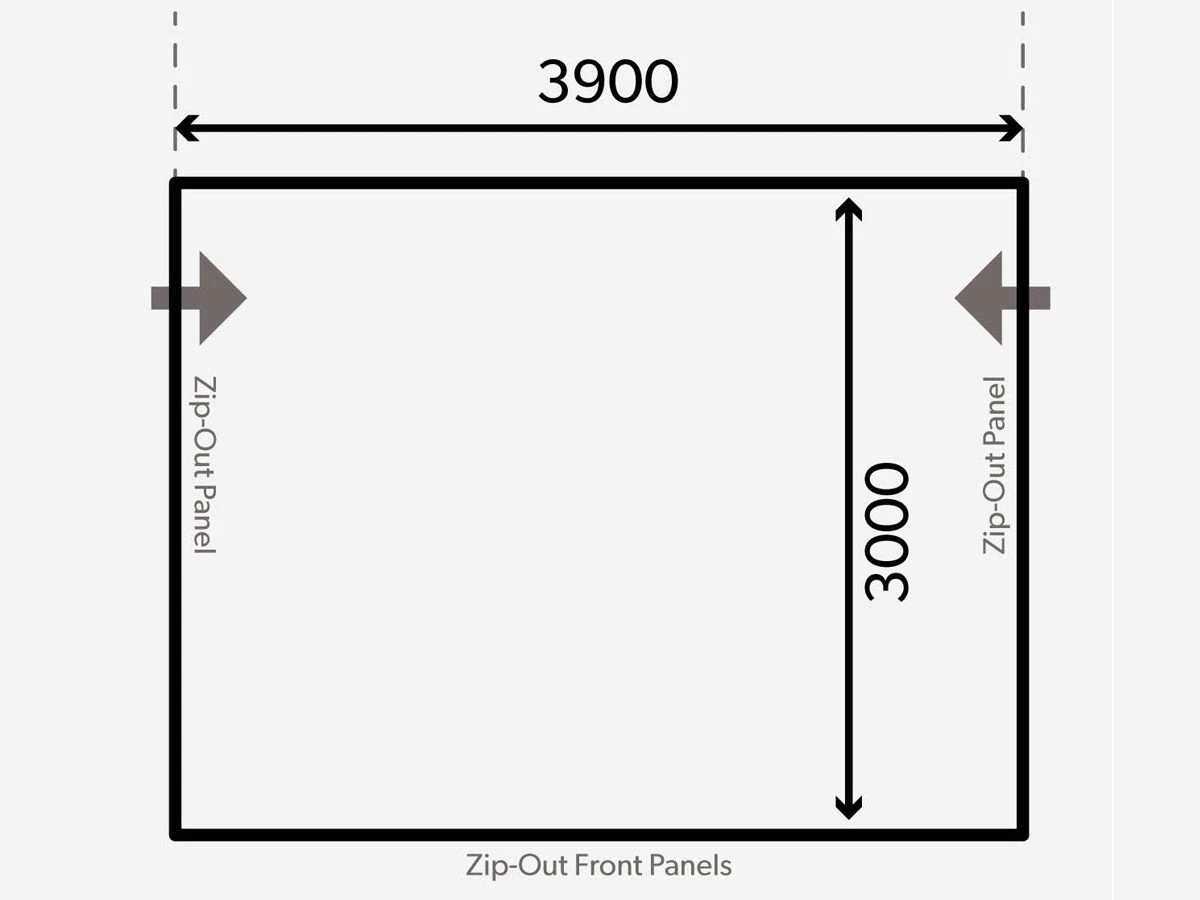 Das Vorzelt ist 390 cm breit. Das bedeutet, dass Ihr Wohnwagen über eine gerade Schiene von mindestens 390 cm verfügen muss, um das Vorzelt aufstellen zu können. Sie möchten das Vorzelt in die Schiene Ihrer Markise schieben? Dann muss die Markise mindestens 400 cm lang sein.