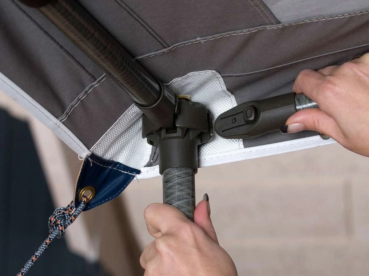 Das Gestänge für des Eclipse Vorzeltvordach ist optional erhältlich. Sie haben die Wahl zwischen einem leichten CarbonX-Gestänge oder dem robusten MegaFrame aus Stahl. Das Gestänge wird mit den Isabella F-Gliedern geliefert, um das Vordachgestänge mit dem Vorzeltgestänge zu verbinden.