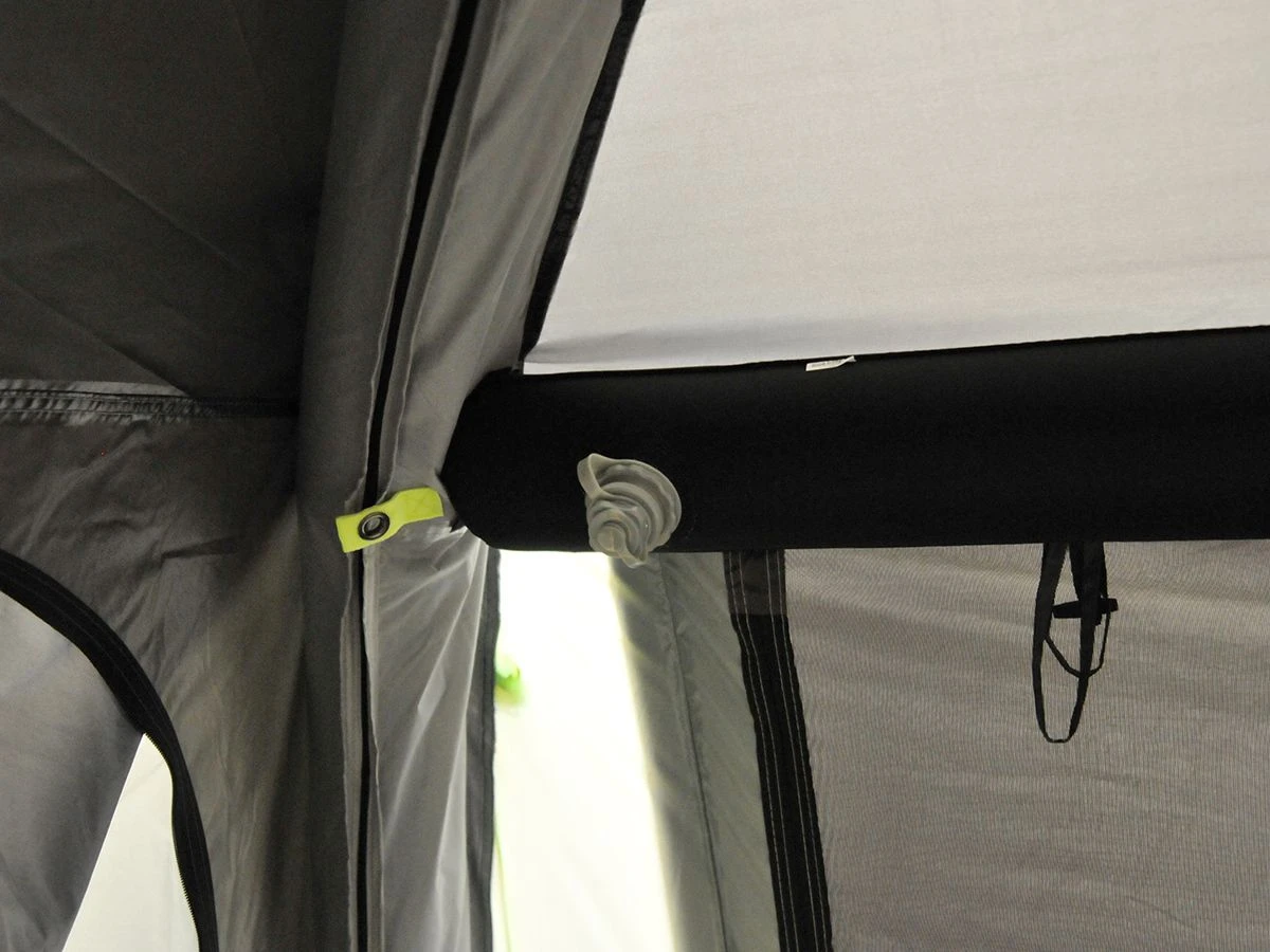 Die aufblasbaren Luftschläuche sorgen für eine stabile Konstruktion. Die Luftschläuche sind mit einer besonders stabilen Ummantelung versehen, sodass eine Beschädigung nahezu unmöglich ist. Der große Vorteil von Luftschläuchen besteht darin, dass sie sich dem Wind anpassen und immer in die ursprüngliche Form zurückkehren. Dadurch werden Beschädigungen verhindert und Sie haben nie mehr verbogene oder gebrochene Zeltstangen. Für zusätzliche Stabilität ist das Ibiza mit zwei aufblasbaren Dachbalken ausgestattet.