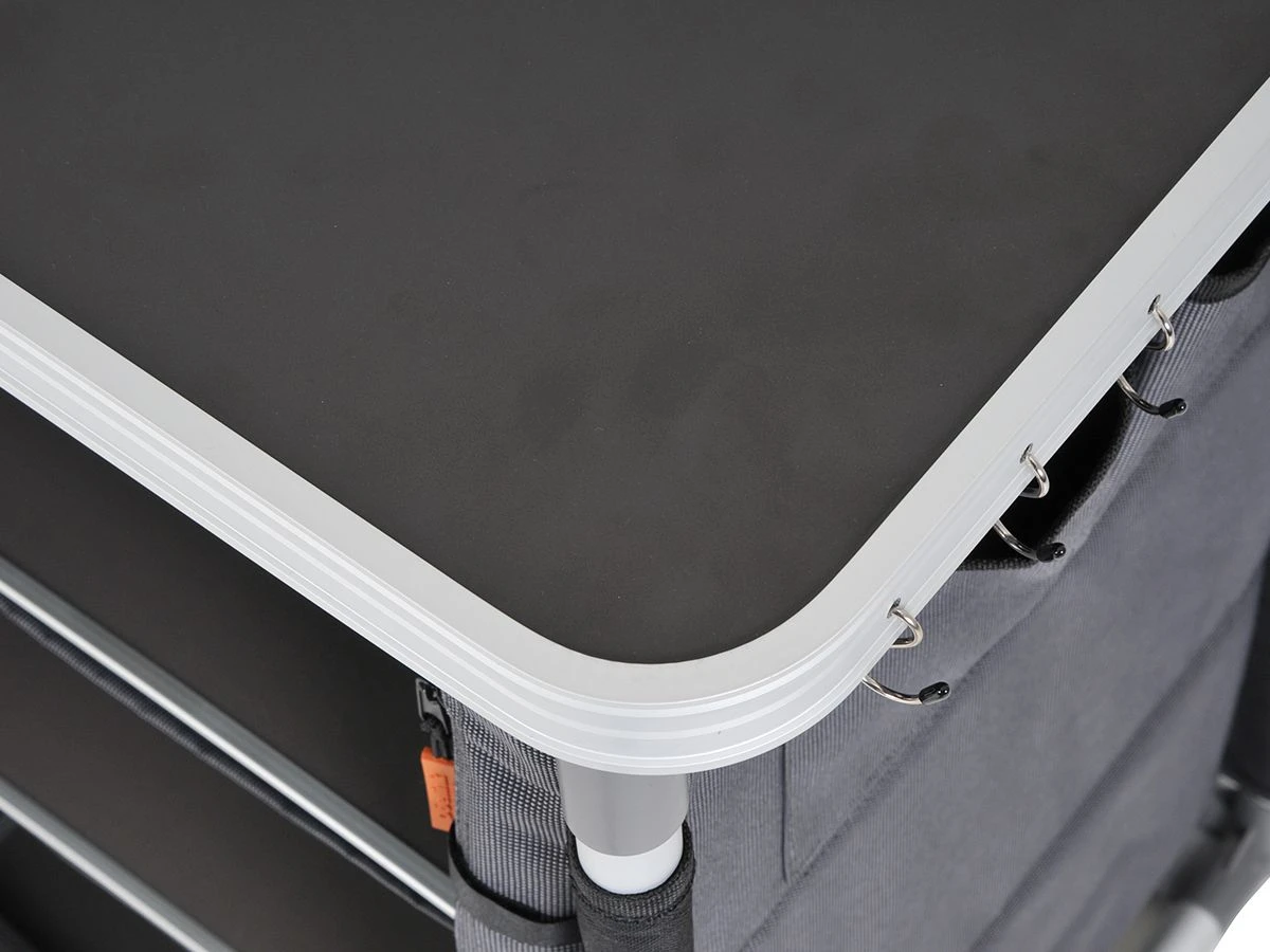 Der Obelink Toulon Luxe ist ein praktischer Campingschrank, der mit 6 geräumigen Staufächern und einer Platte aus Aluminium ausgestattet ist. Diese Oberplatte ist hitze- und wasserbeständig und daher ideal als Kochstelle.