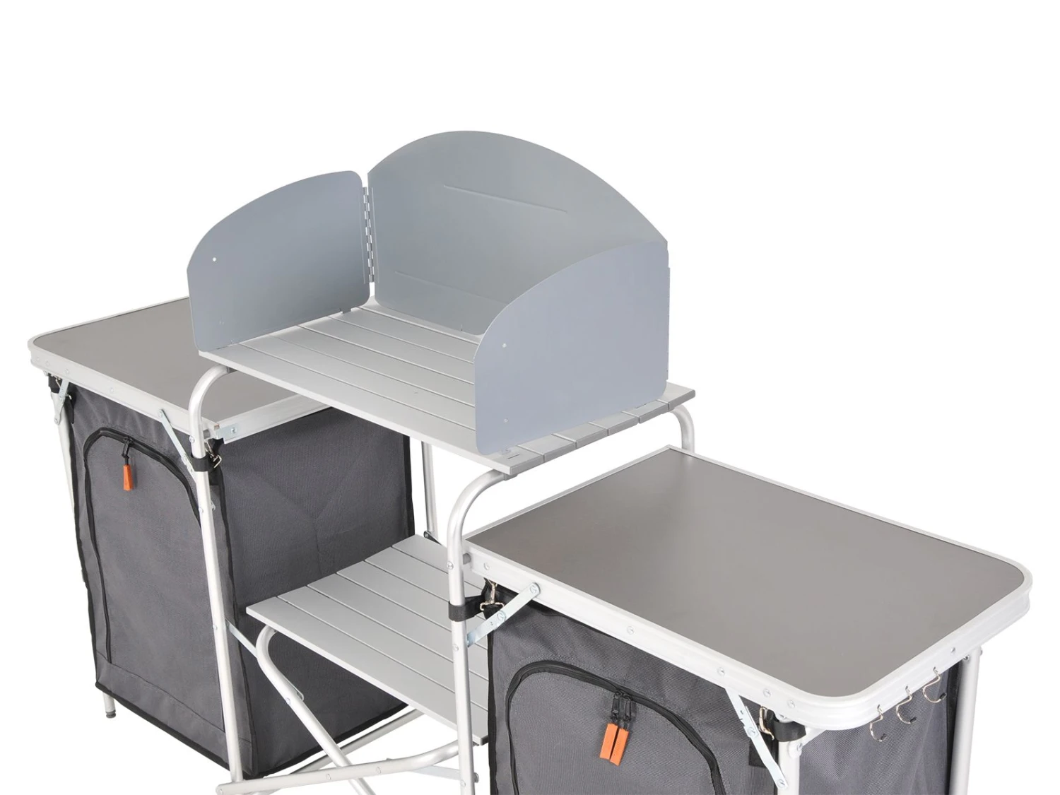 Bereiten Sie gerne leckere Mahlzeiten auf dem Campingplatz zu? Dann ist die Obelink Tricias Luxe die ideale Campingküche für Sie. Die Tricias besteht aus 3 Arbeitsplatten, von denen die Mitte für Ihren Herd bestimmt ist, so dass Sie auf beiden Seiten Arbeitsfläche haben. Die beiden Außenschränke sind mit einem Regal ausgestattet und können einfach verschlossen werden.