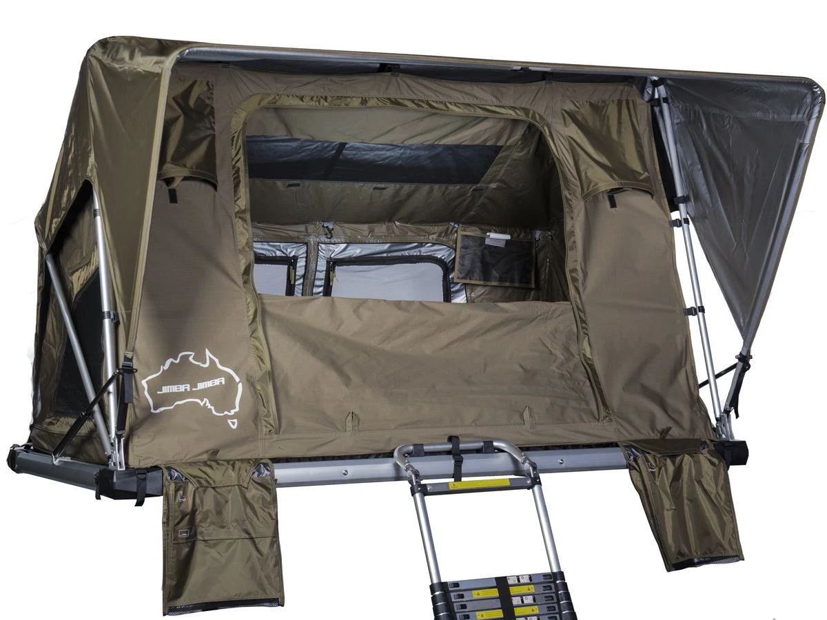 Dank der leichten Konstruktion kann das Jimba Jimba Large auf nahezu jedem Auto mit Dachträgern montiert werden. Mit den mitgelieferten Halterungen kann das Zelt ganz einfach wie eine Dachbox montiert werden. Das Jimba Jimba ist mit einem wasserdichten Bezug ausgestattet, sodass das Zelt und die integrierte Matratze bei schlechtem Wetter trocken bleiben. Dank der integrierten Gasdruckfedern lässt sich das Jimba Jimba einfach ein- und ausklappen. Die mitgelieferte Teleskopleiter sorgt dafür, dass Sie problemlos in das Zelt gelangen.