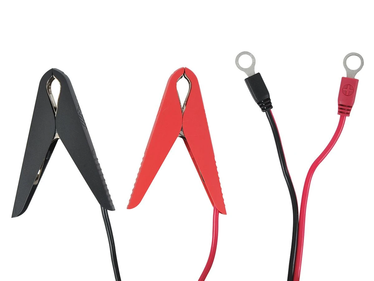 Das Ladegerät wird sowohl mit Ladezange als auch mit M8-Anschlussösen geliefert, was den Anschluss der Batterie erleichtert. Bei Bedarf kann die Batterie dauerhaft angeschlossen bleiben.